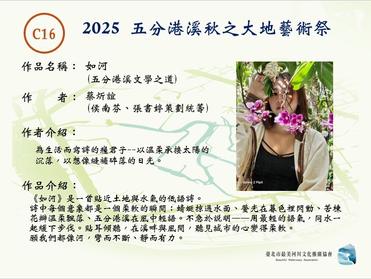 *Note: “Powderpuff stream” refers to the native Barringtonia racemosa, a riverbank flower abundant along Wufen Stream (五分港溪, romanized Wufengang) in Taipei.