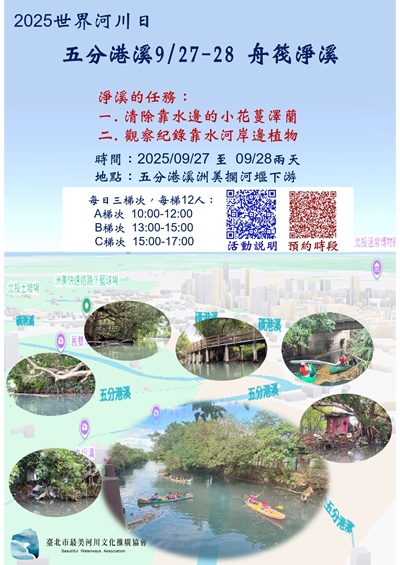 本次2025世界河川日舟筏淨溪行動的範圍是,從五分港溪洲美攔河堰的下游,至北投焚化廠洲美運動公園之河道與河岸。