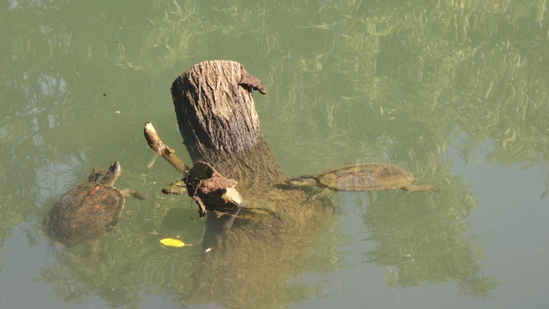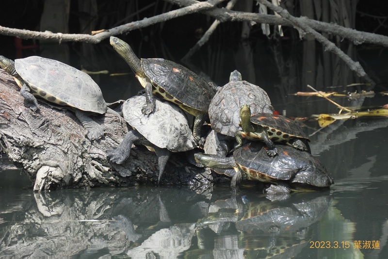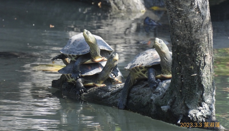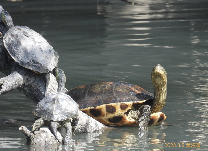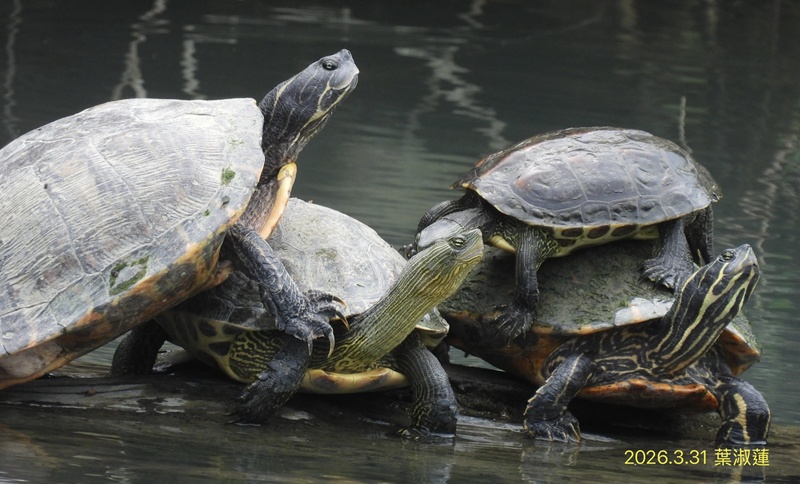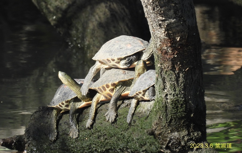 三年前的春天,無意間看見水面上有兩三隻斑龜,正努力攀上體型較大的母龜背上,只為多佔一點曬太陽的位置。那逗趣而生動的畫面,讓人忍不住停下腳步。