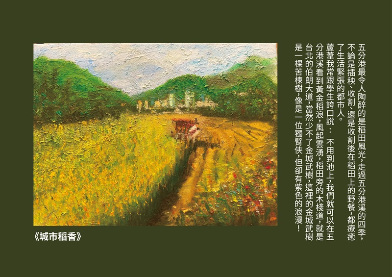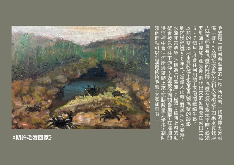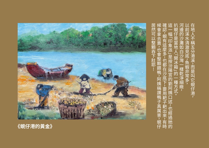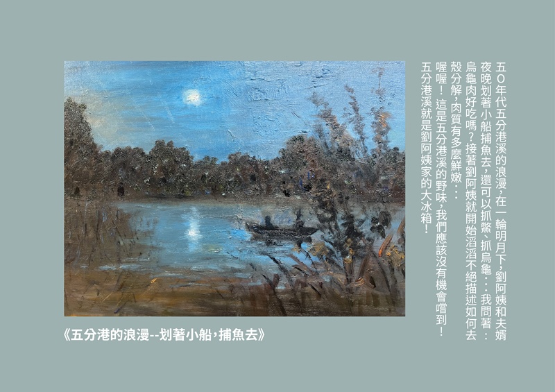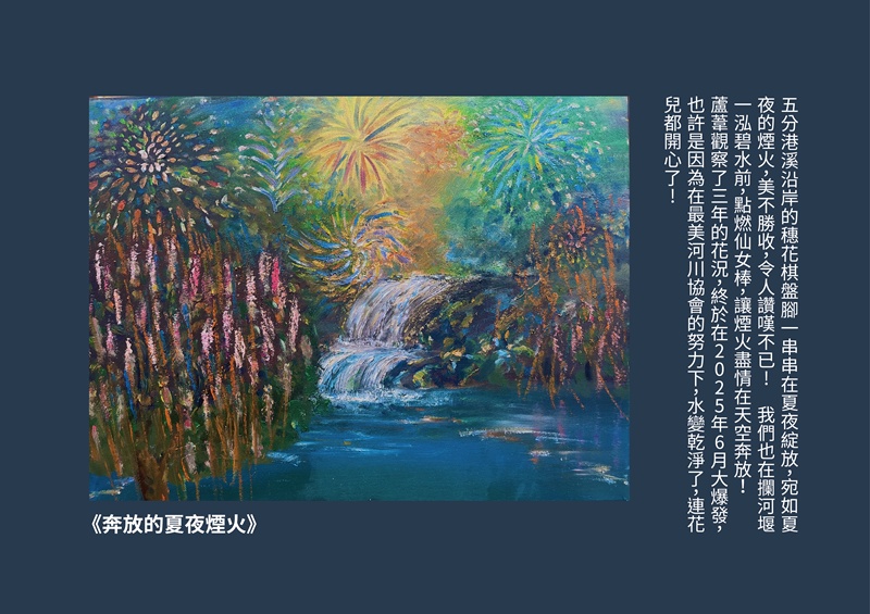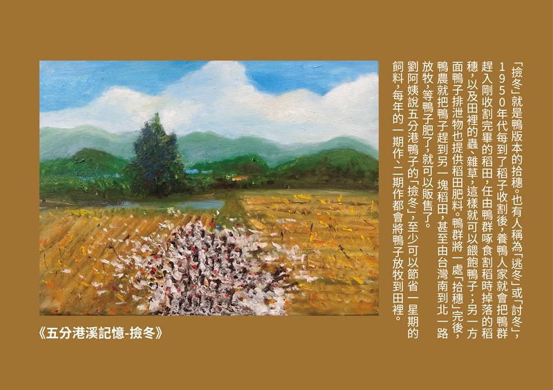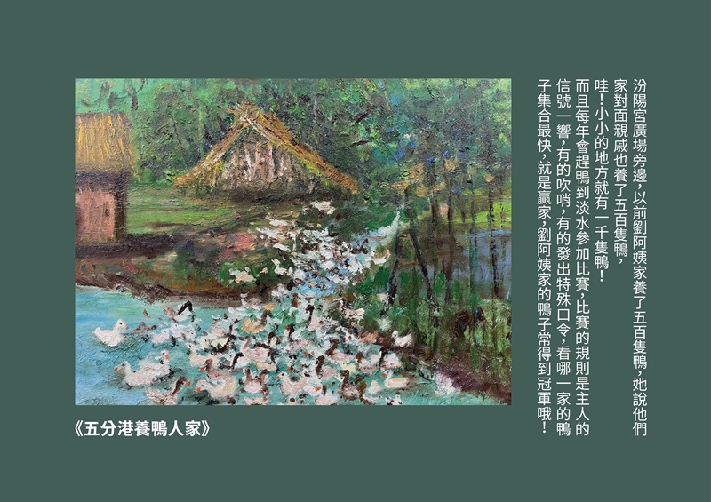 每一次的走讀只要遇到汾陽宮的劉阿姨,一定會請她講述五分港溪過去的景象,除了黃金蜆以外,有一天,劉阿姨突然提起她們家有養500隻鴨子的過往,滔滔不絕說起鴨子從何處下水、鴨寮在哪兒、如何到淡水參加比賽、如何度冬等等…,蘆葦覺得這是一段是非常寶貴的口述歷史,下定決心要將過往的五分港溪用油畫方式呈現出來,讓每一位到訪者,都能更了解五分港溪的歷史,知道這一條河,過去曾經乾淨過,也養活了沿岸的人家。希望能有更多人加入美川協會,讓「土健康、水乾淨」,一起保護這塊台北市的綠寶石 !